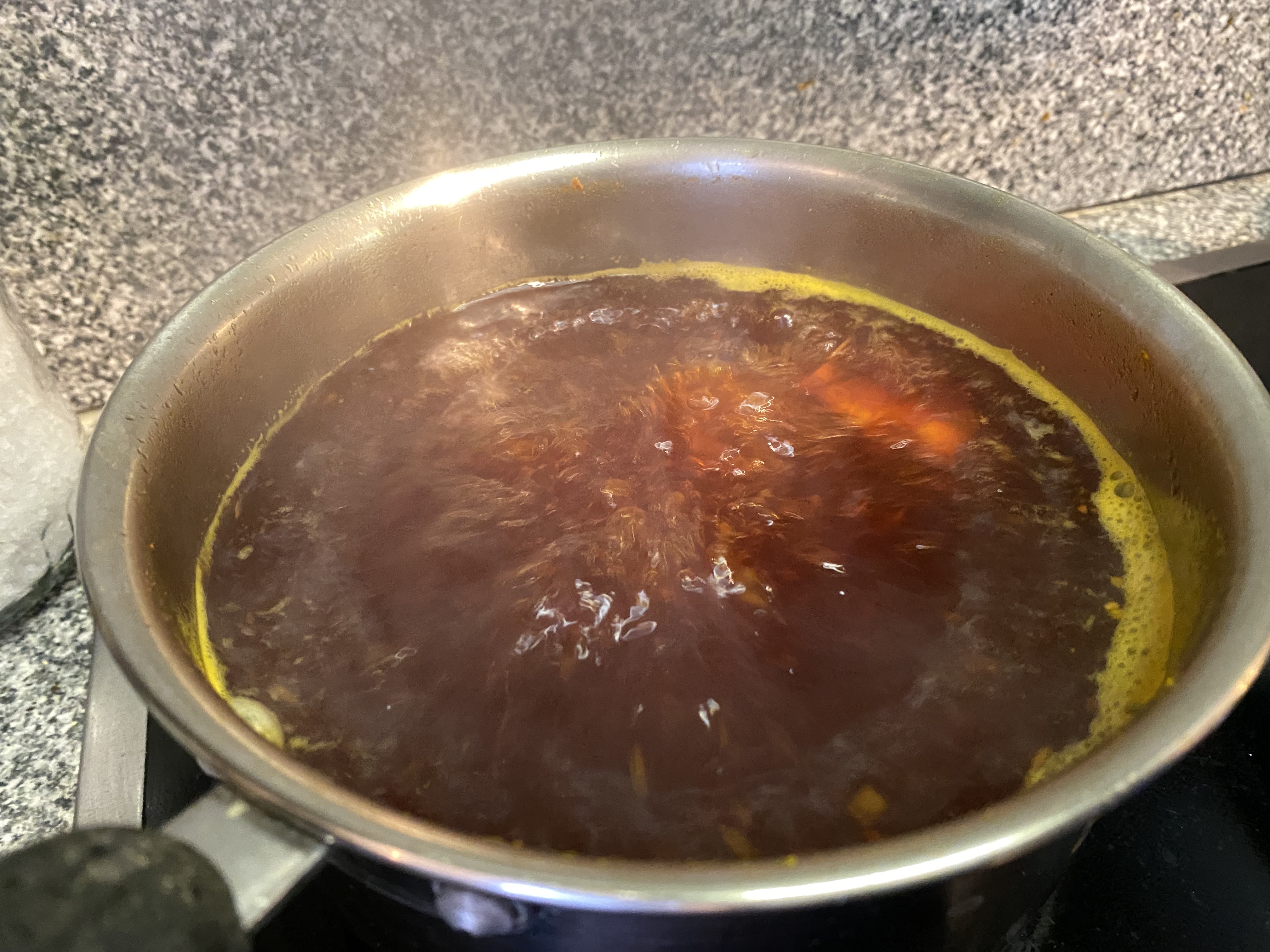 Bring to boil and keep boiling with almost closed lid for about 10-15 min. If the Tumeric is of good quality, you will get a reddish colour. Wait until liquid has reduced by about 10-15%.